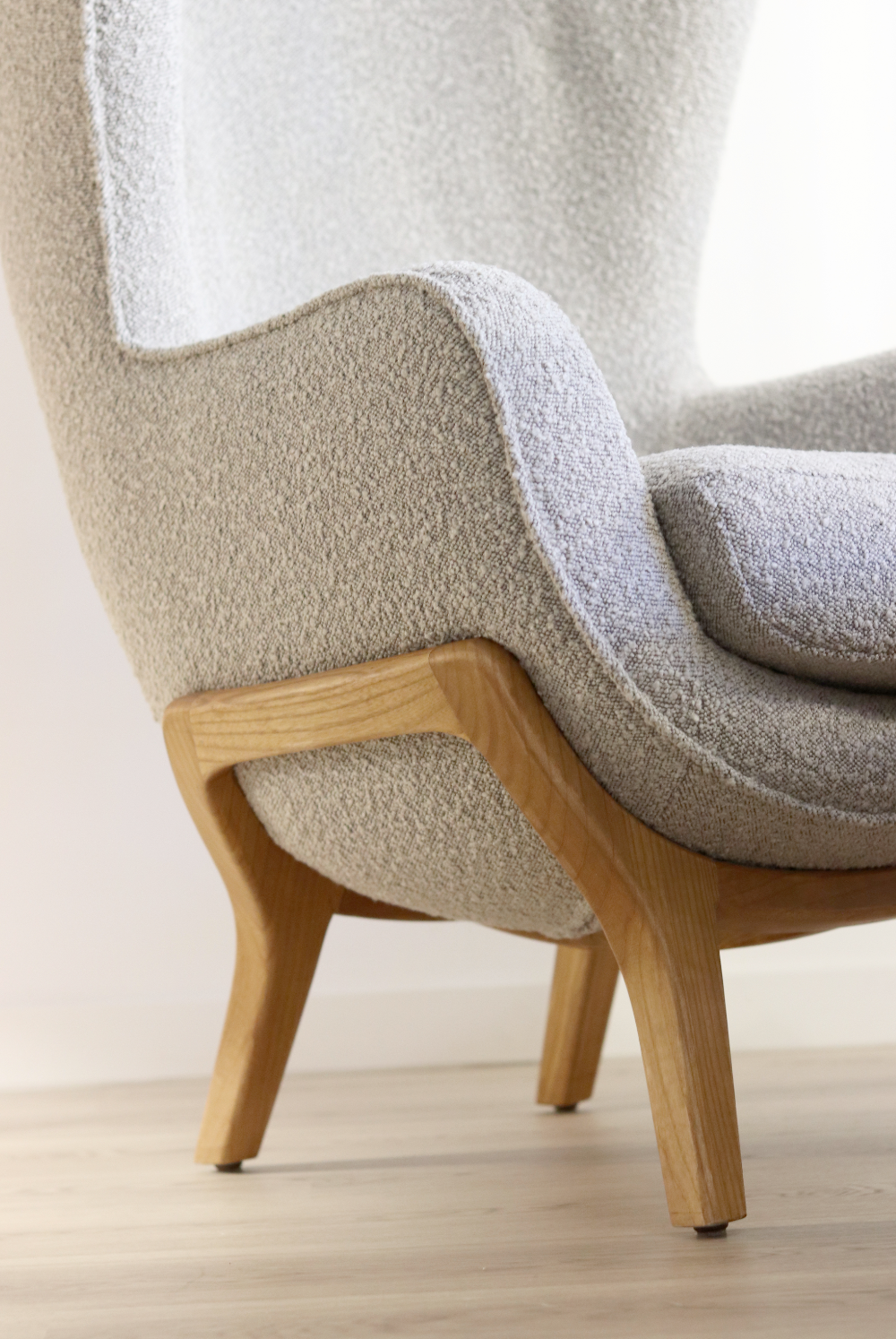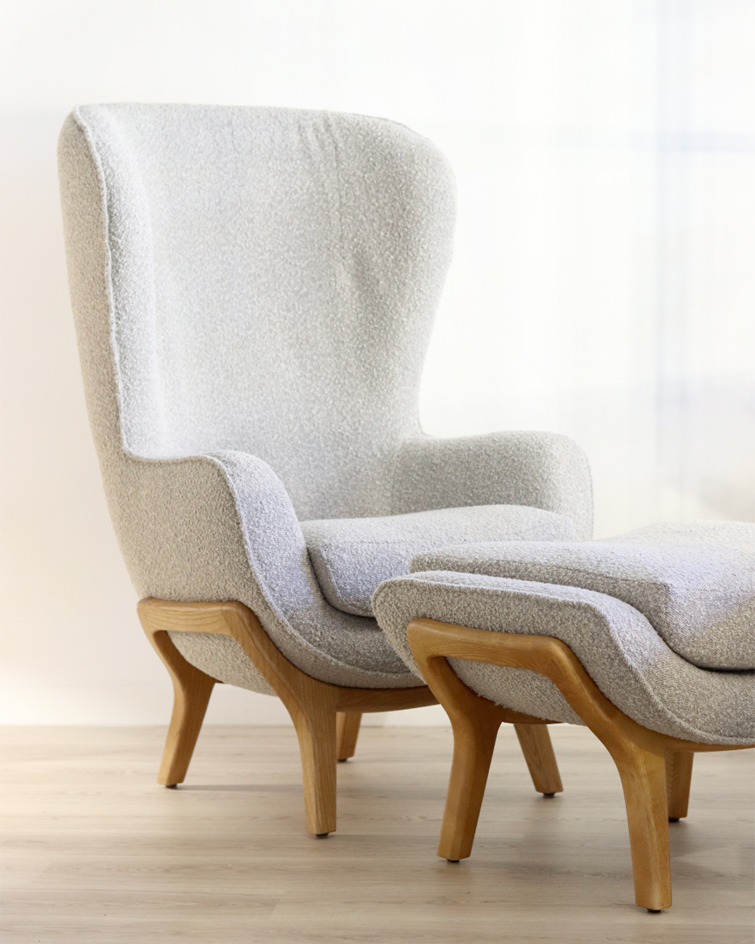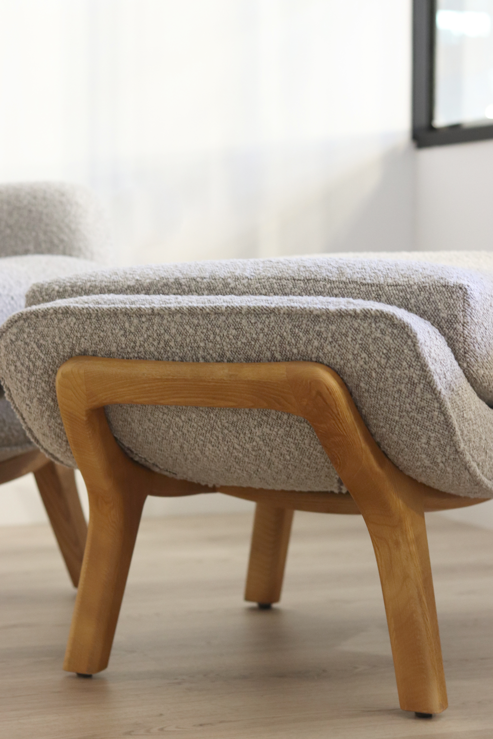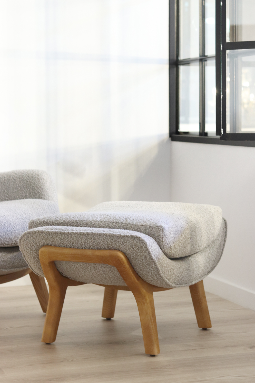 Elegante conjunto de poltrona e pousa-pés, que convida a relaxar e passar momentos de leitura. Estofo em tecido bouclé cinza pedra e pés numa estrutura modelada em madeira de carvalho natural. O pousa-pés também pode funcionar perfeitamente como uma pequena mesa lateral de apoio.