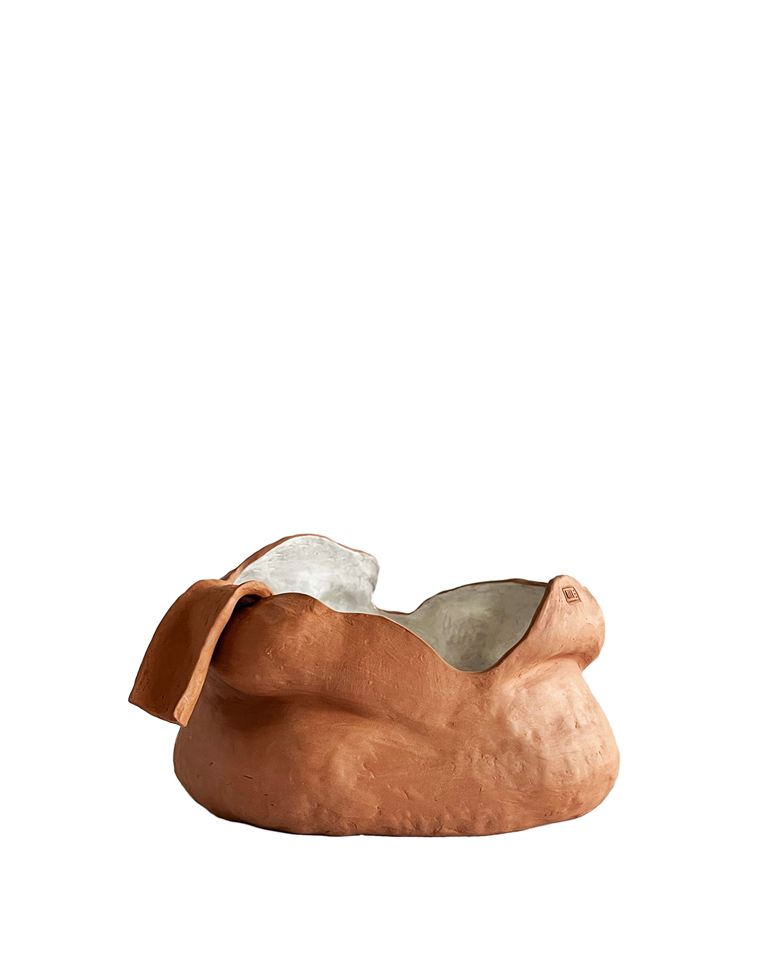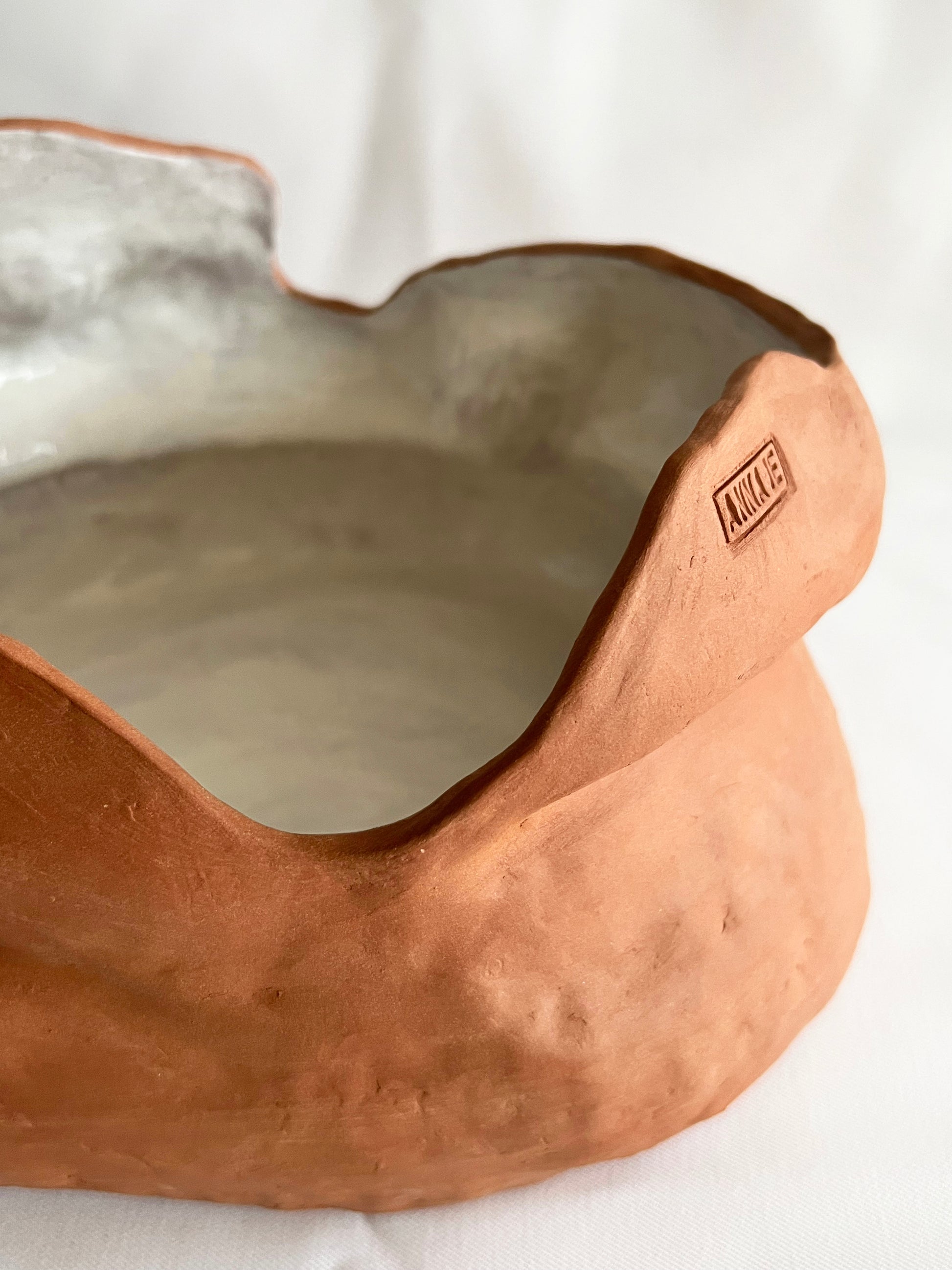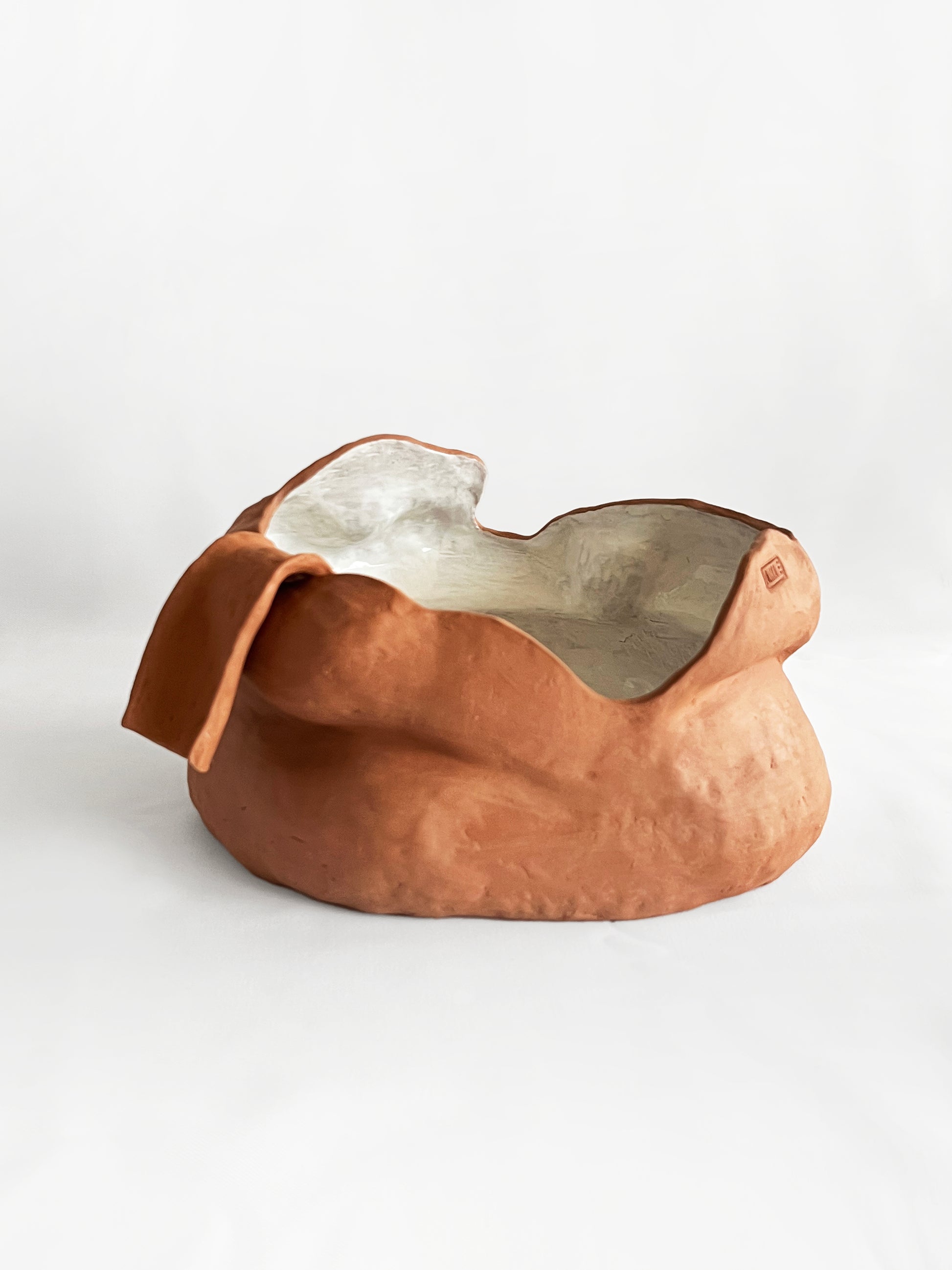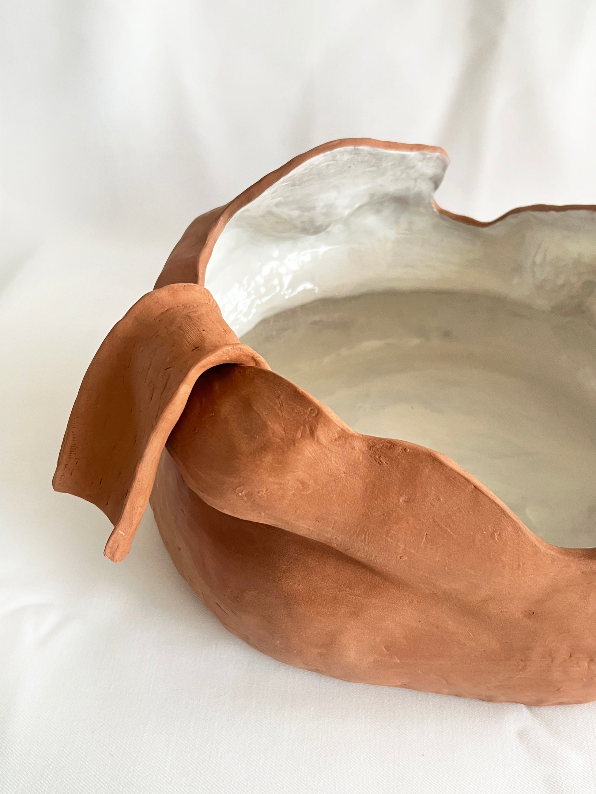 Peça em forma de tigela cuidadosamente trabalhada. Perfeita para colocar frutas, flores... ou simplesmente vazia, mostrando toda a sua forma e beleza como peça decorativa. O seu interior é vidrado o que torna a peça resistente à prova de água e o pequeno detalhe na parte superior esquerda da peça é amovível, e pode ser removido.