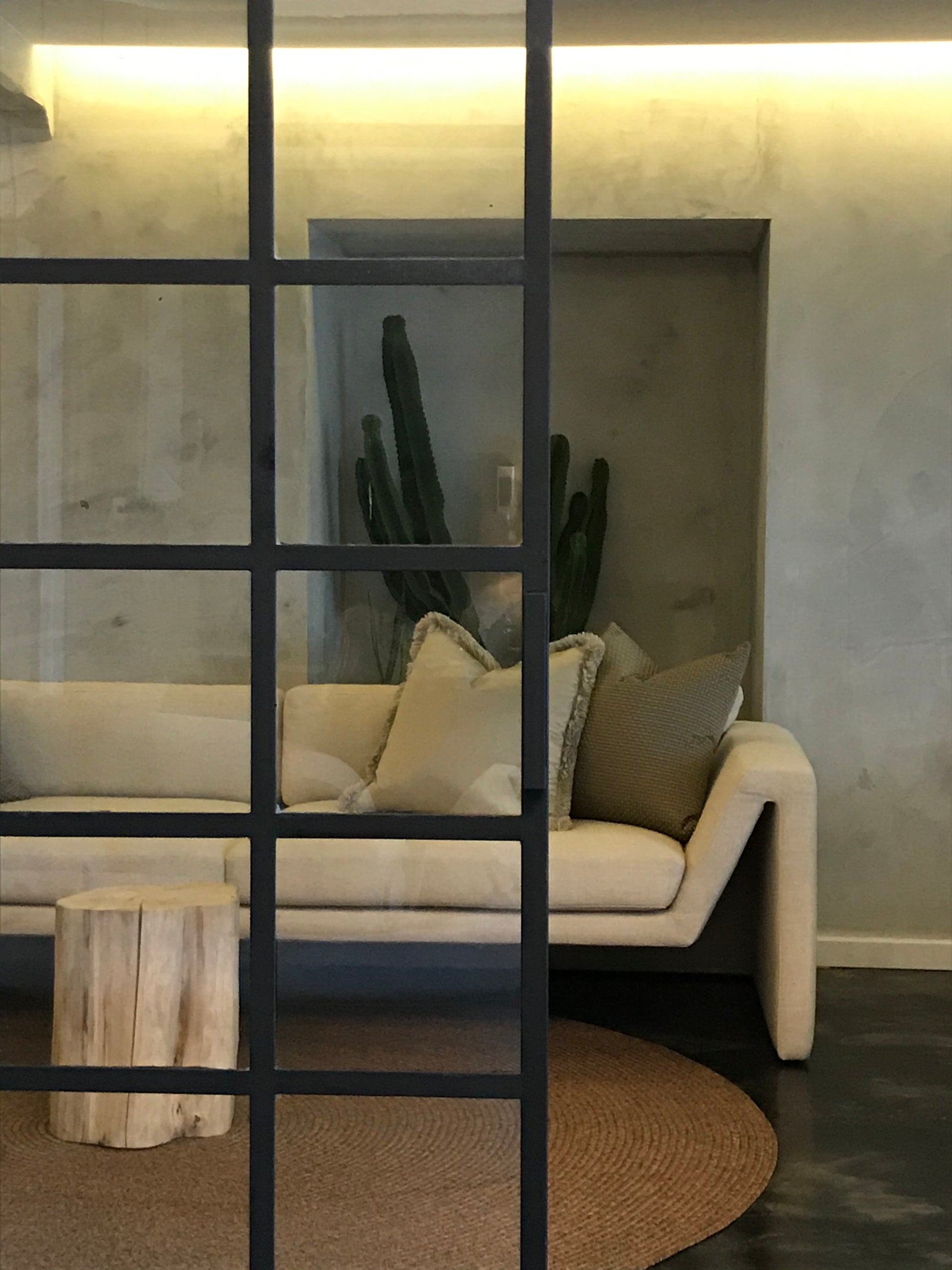 Sofá de design moderno e linhas depuradas. A sua estrutura é toda uma peça continua, os apoios de braço prolongam-se, tornando-se também em pés, e o espaço por baixo do assento é amplo. O tecido é texturado e oferece um toque único e reconfortante.