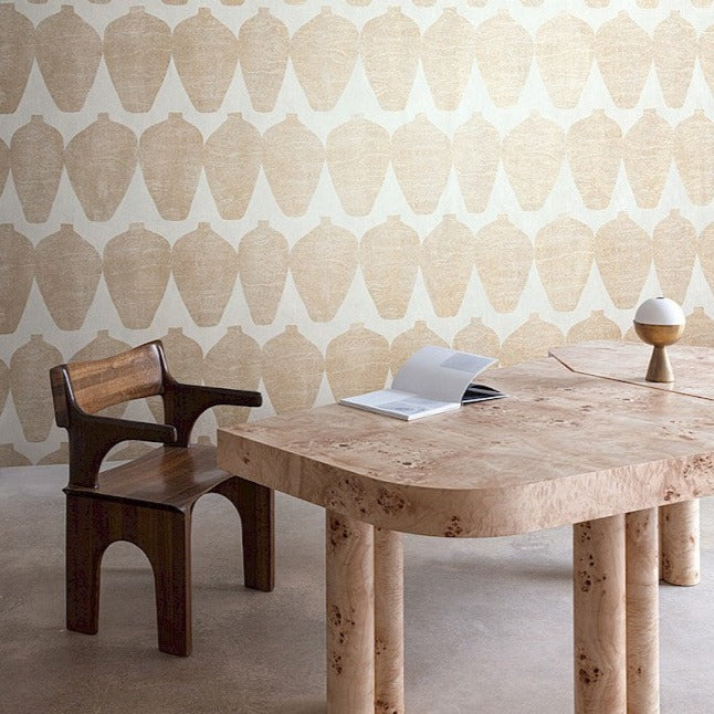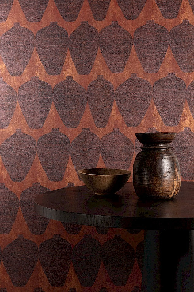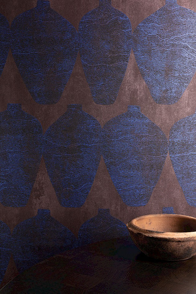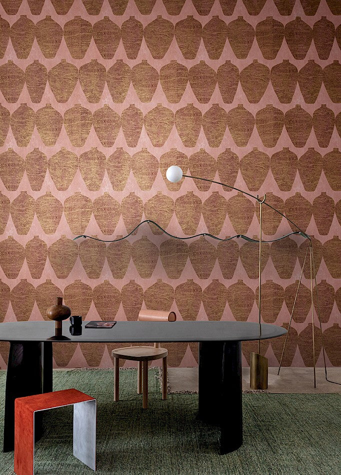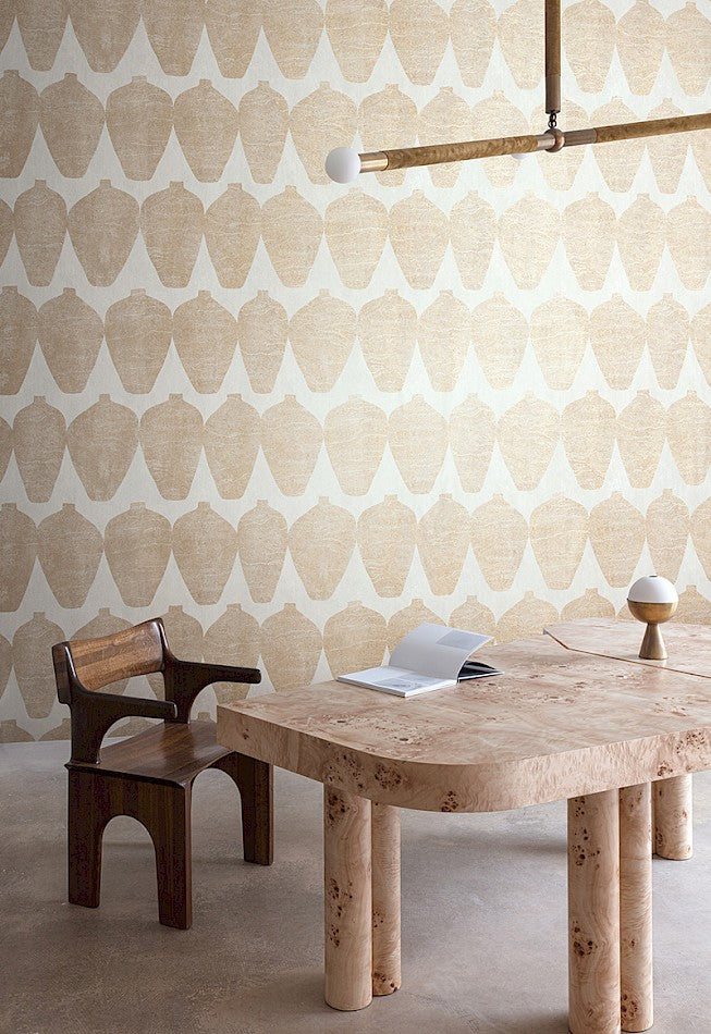 O papel de parede Hemia remete-nos aos tempos primitivos e ancestrais, com a sua representação gráfica de vasos de argila. Um equilíbrio maravilhoso entre a textura fosca do barro e o brilho do esmalte. É um papel entre o áspero e o liso.