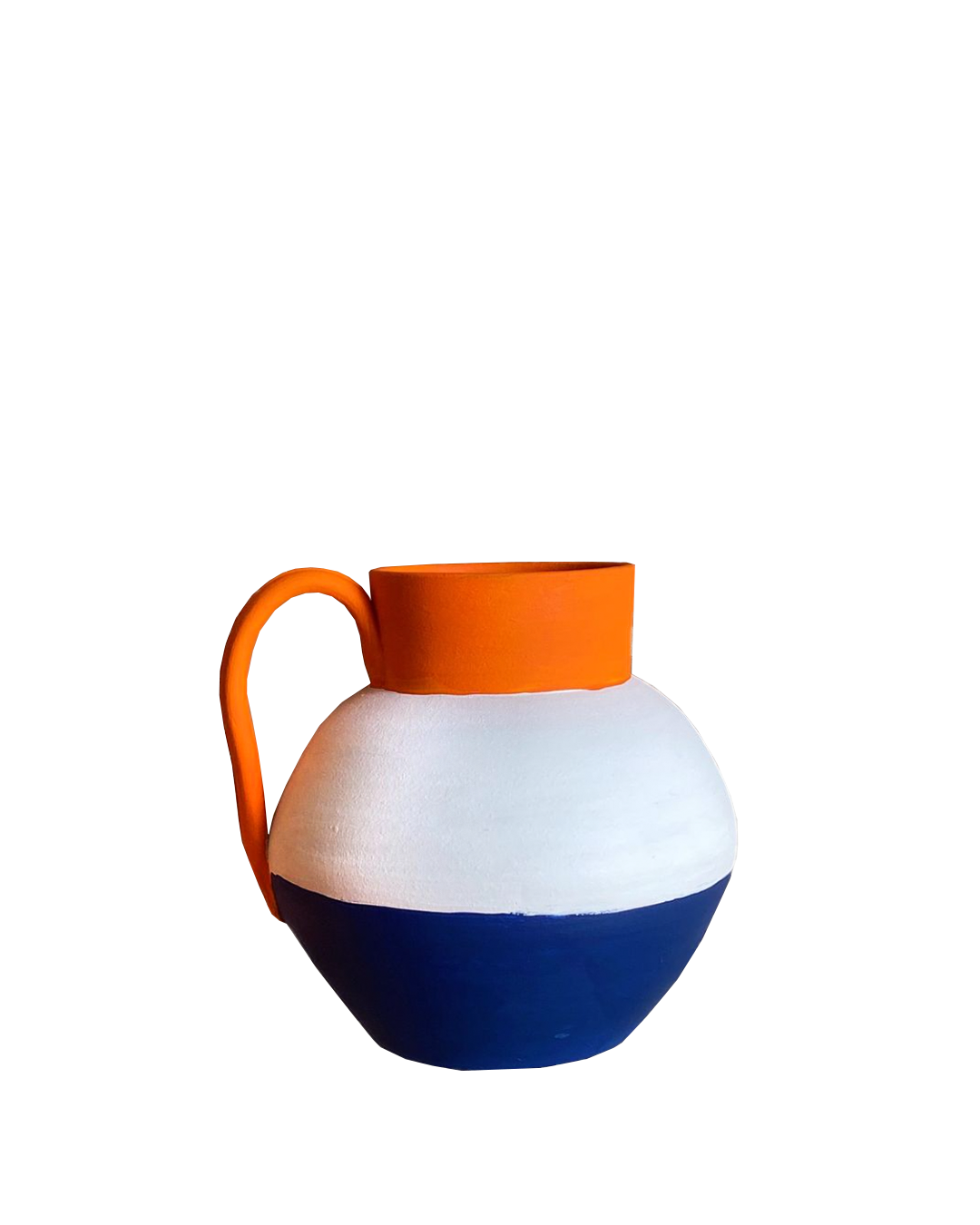 Jarro colorido e de grande formato produzido em cerâmica terracota . É por isso, uma peça distinta com as suas ligeiras variações por ser uma peça produzida manualmente.