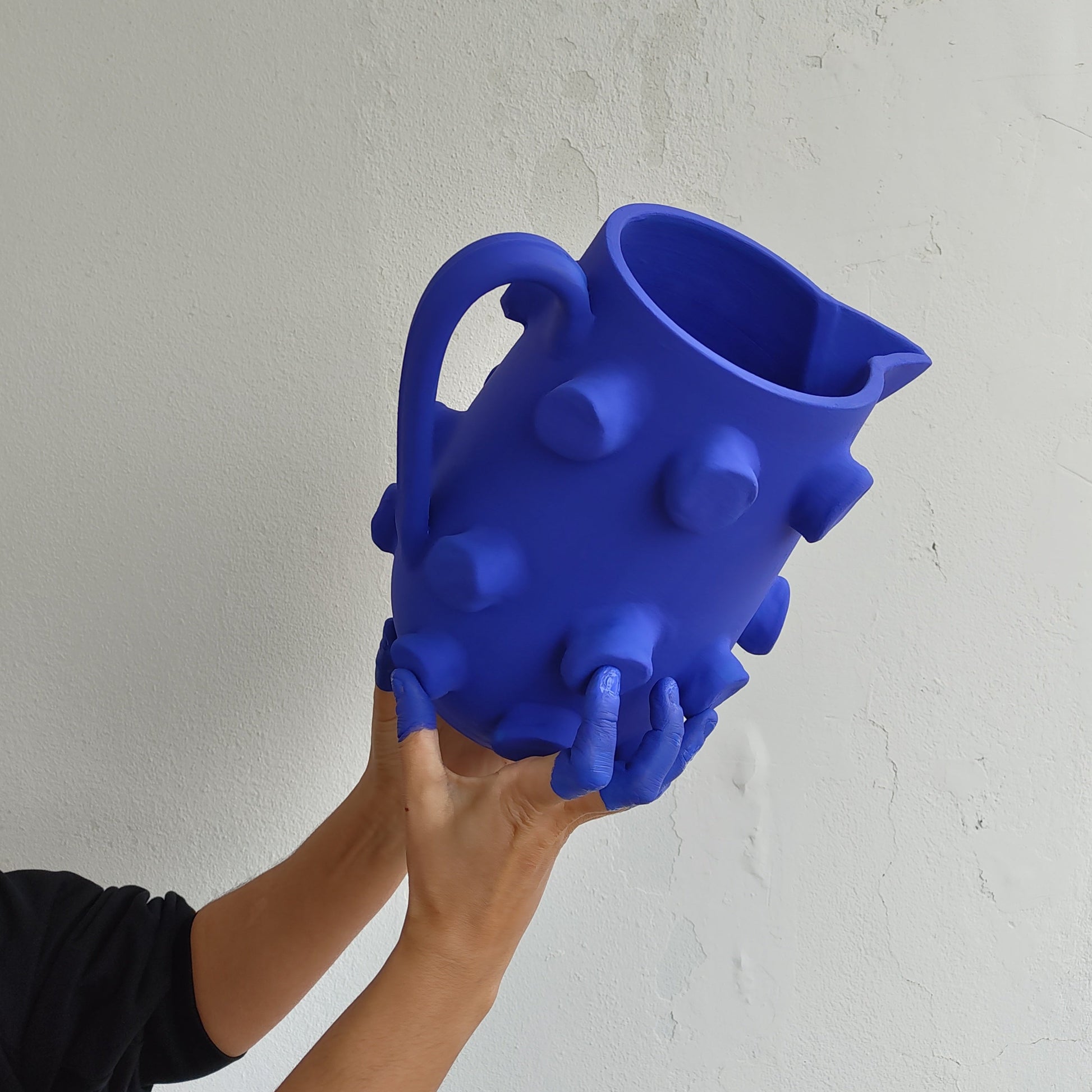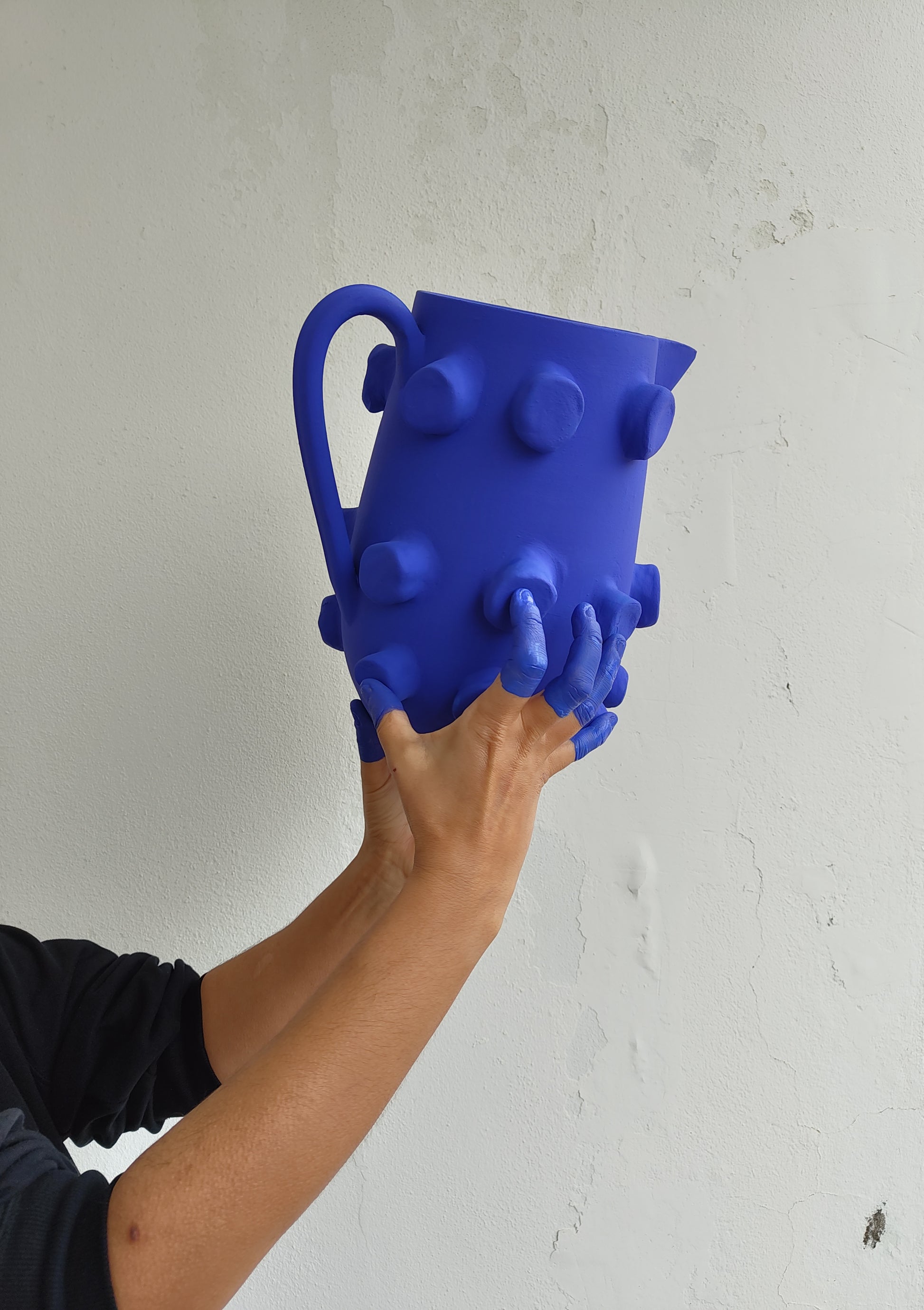 Jarro de grande formato em cor azul profundo. A sua forma é muito original, pouco discreta e reflete o humor e a alegria que as peças de Liliana Silva transmitem. É uma peça distinta por ser produzida manualmente e por isso pode ter inerentes ligeiras variações.